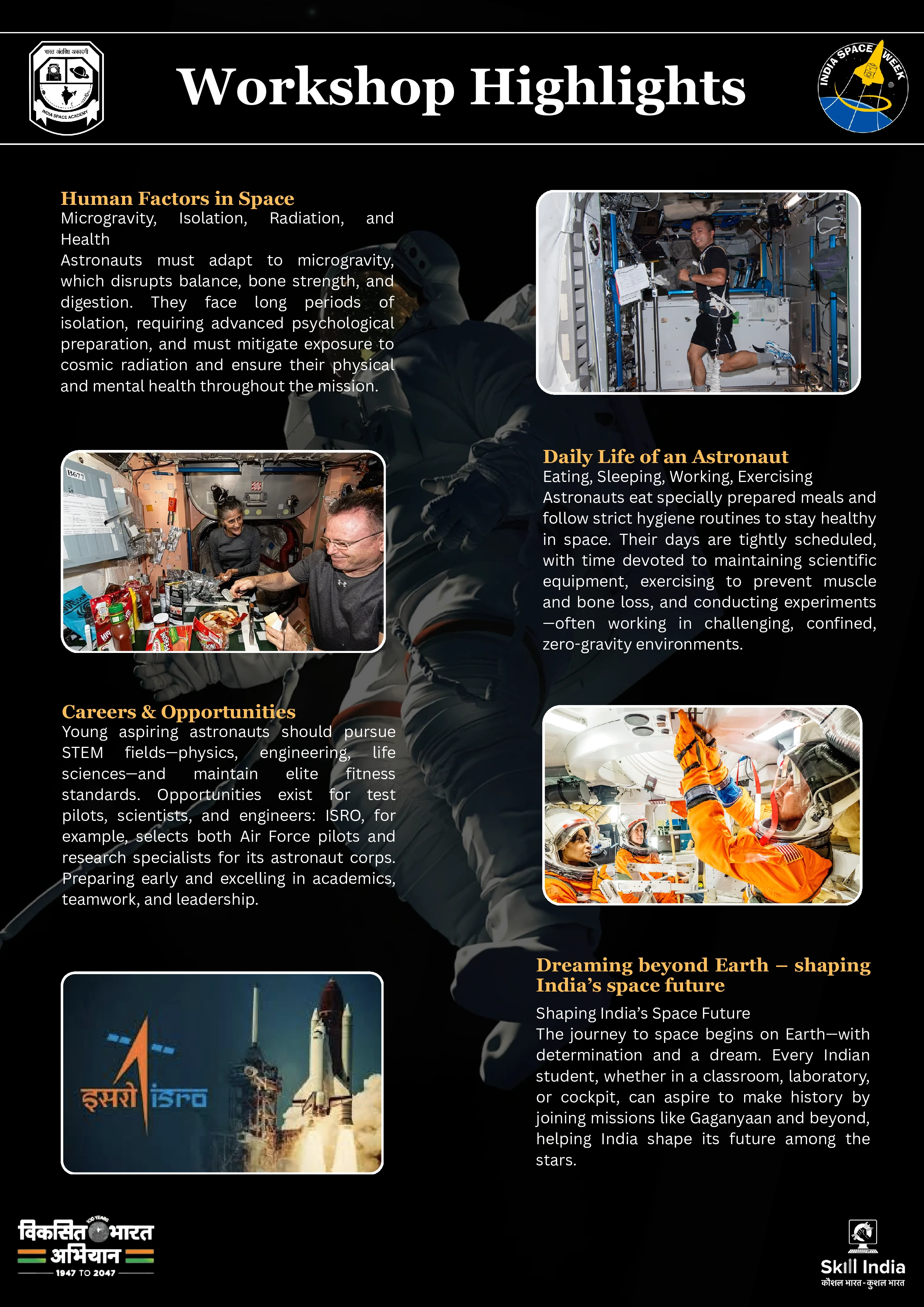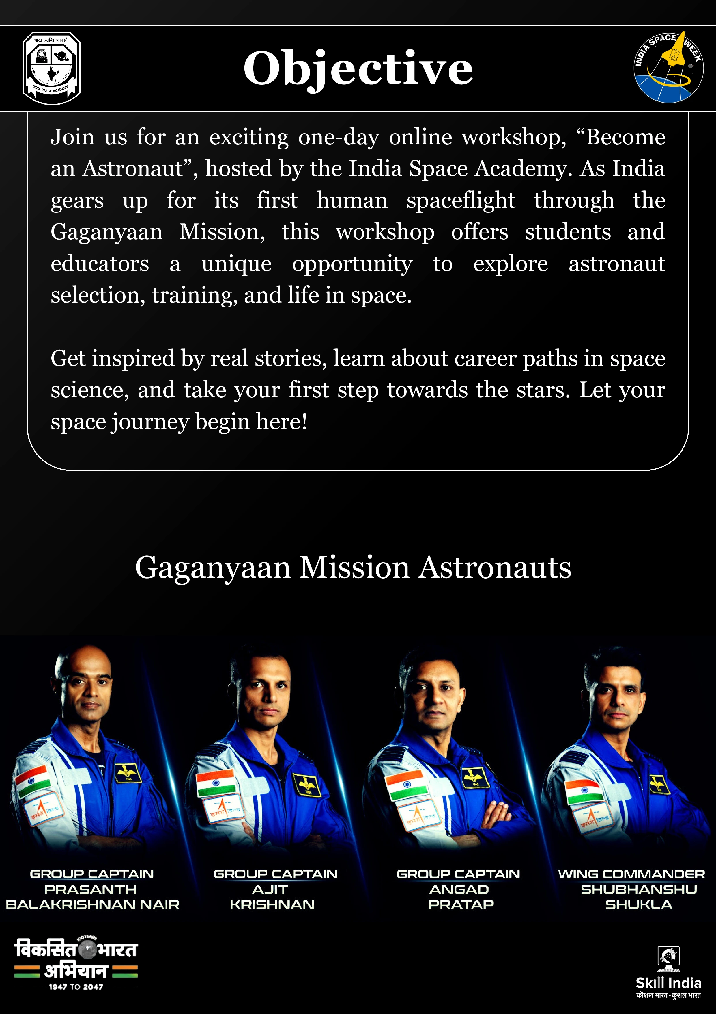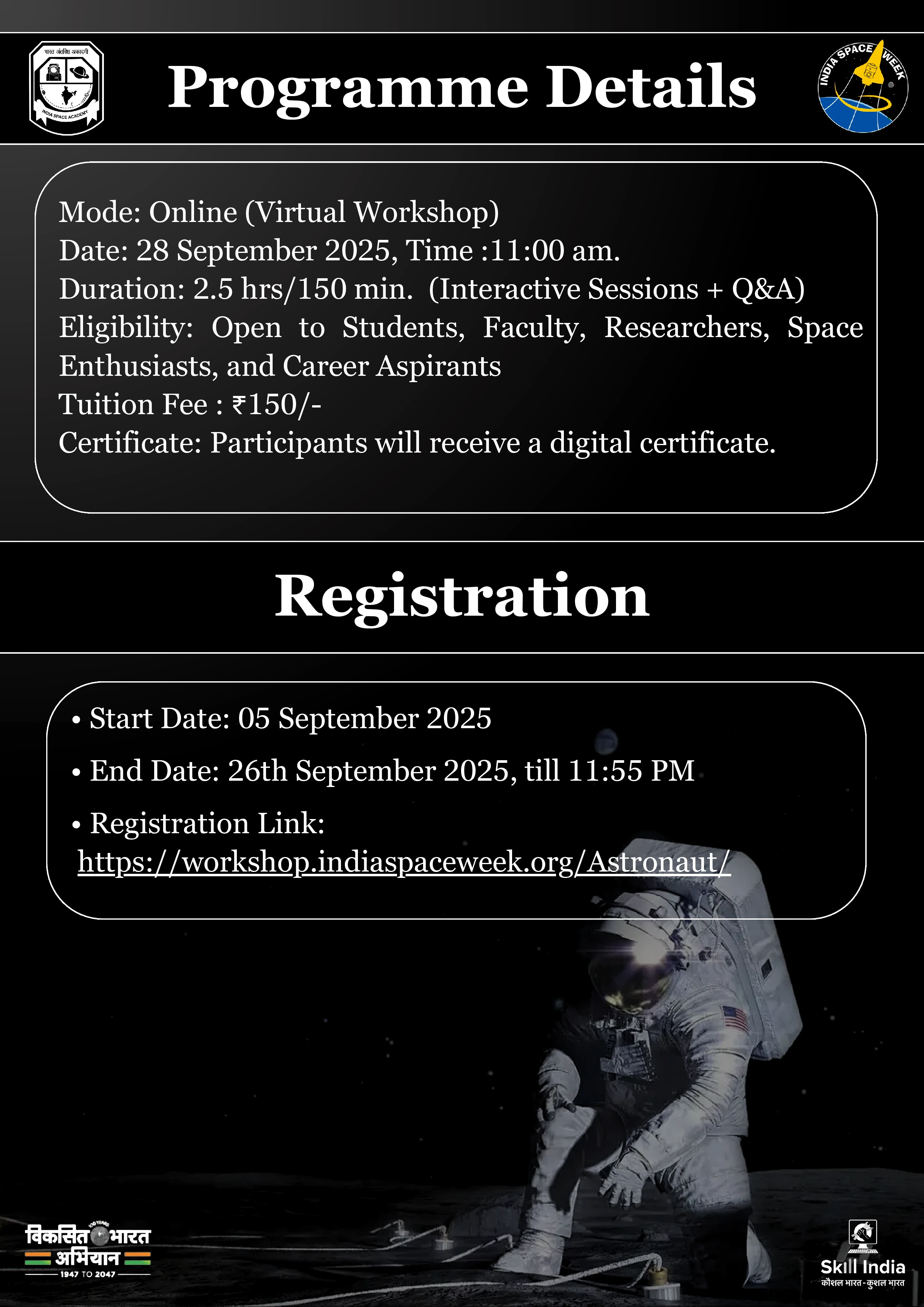 The link for tomorrow's workshop (Become an Astronaut) will be sent to your registered email ID by 5:00 PM. In case you did not receive the email, please send a WhatsApp message to 8130317917